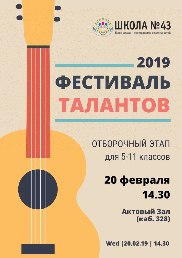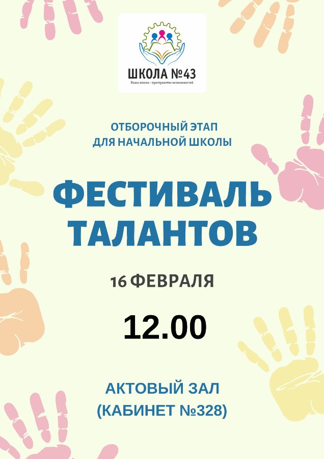 Уважаемые родители (законные представители), обучающиеся! Отборочные этапы фестиваля талантов "Пространство Возможностей" состоятся 16 февраля в 12.00 (1-4 классы) и 20 февраля в 14.30 (5-11 классы). Место проведения: Актовый зал (каб. 328).
