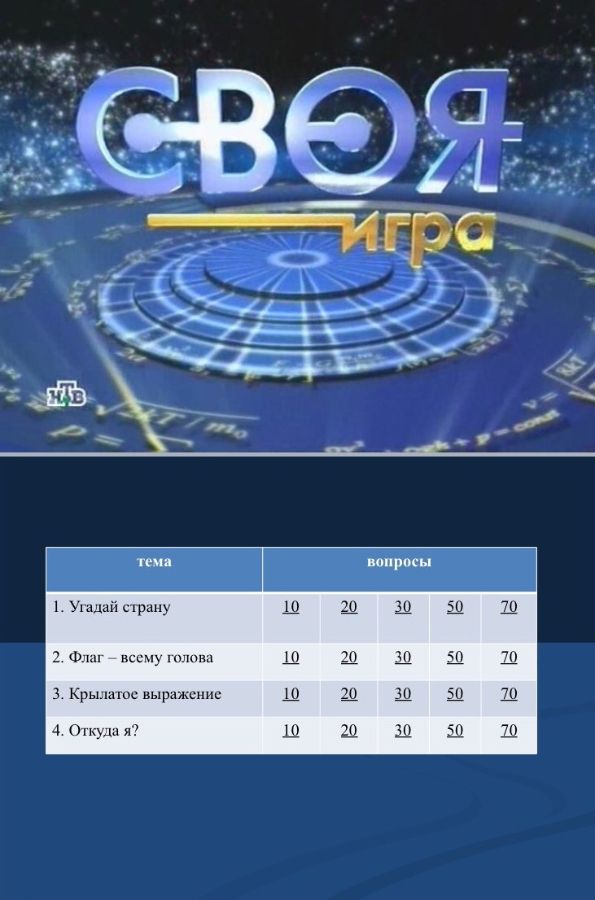 Мероприятие проходило в стиле телевизионной передачи «своя игра», где было 4 категории вопросов: угадай страну, флаг-всему голова, крылатое выражение и откуда я? В данных категориях нужно было угадать страну по описанию, по флагу, догадаться в какой стране зародился тот или иной фразеологизм и вспомнить где родилась та или иная личность.