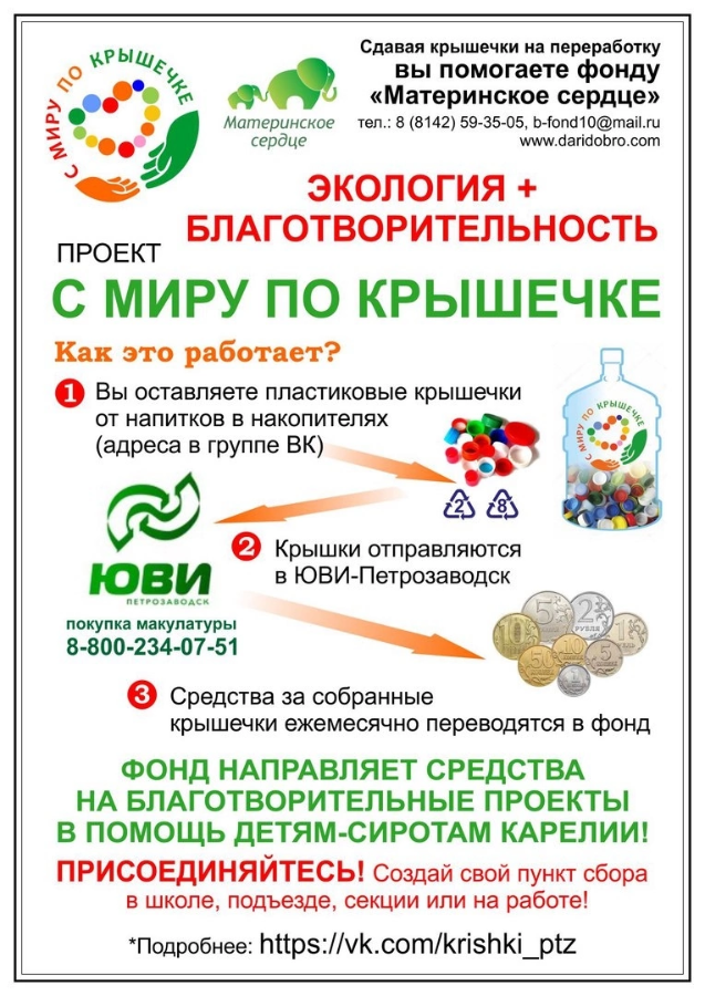 Каждая крышечка, сданная в переработку - это снижение вредных выбросов в окружающую среду, а значит вклад в здоровье Вас и Ваших близких!