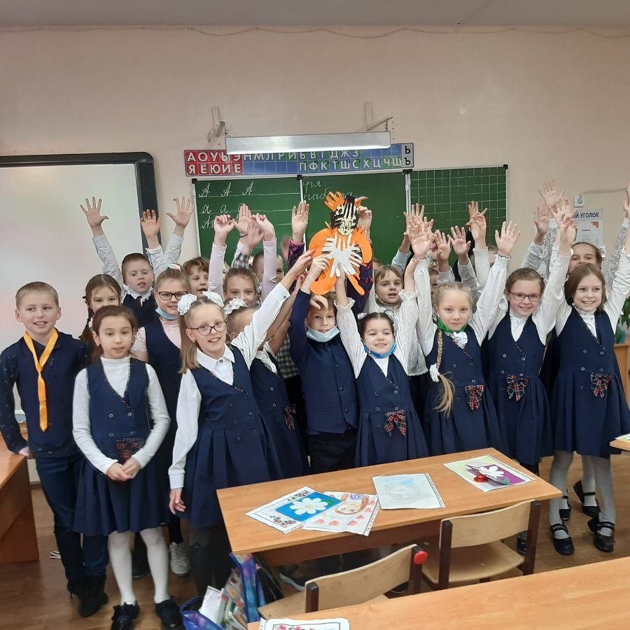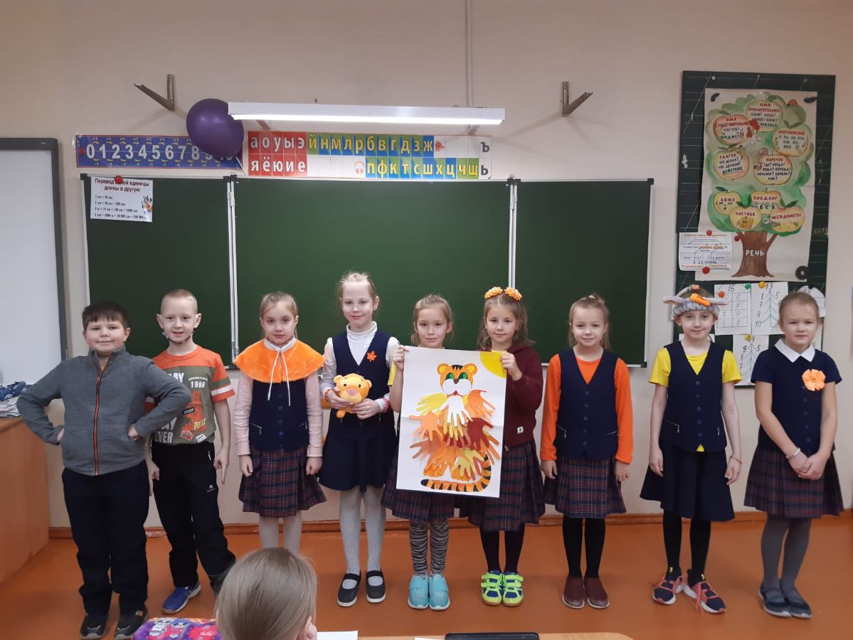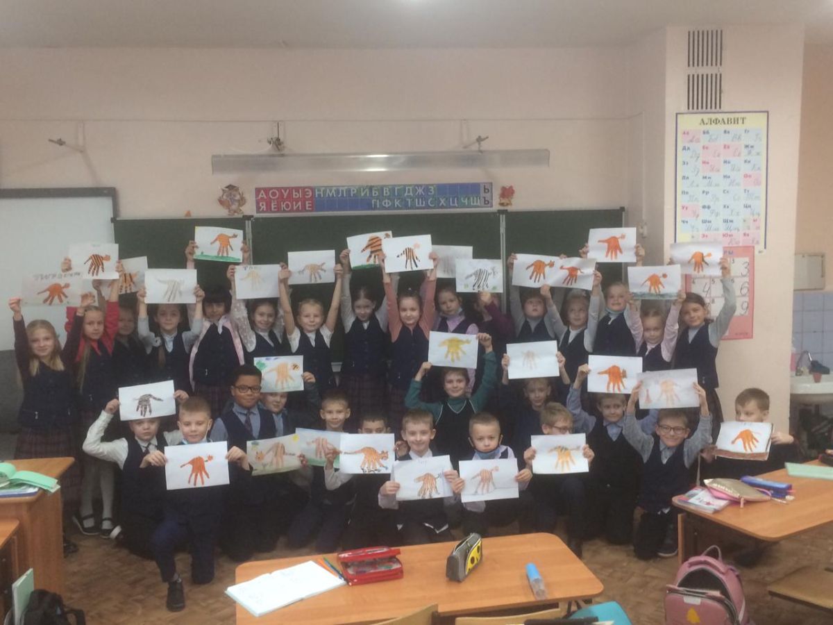 А для ребят 2 – 4 классов этот день был посвящён будущему хозяину года – тигру. В рамках работы над проектом, посвященному году «Науки и технологии. Экология. В защиту амурского тигра» Учащиеся делали аппликации тигрят из ладошек. Вот что у них получилось!