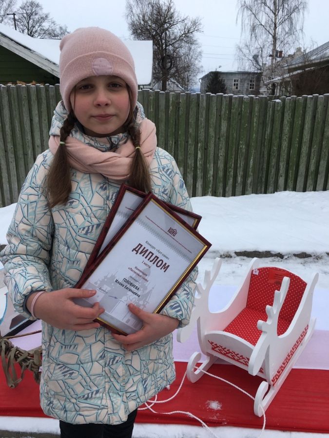 Поздравляем ученицу 5 «В» класса Илону Головневу с победой в конкурсе «Арт-сани», проведенном музеем-заповедником «Кижи» в рамках праздника «Арт-зима в Старом городе» 8 февраля 2020 г.