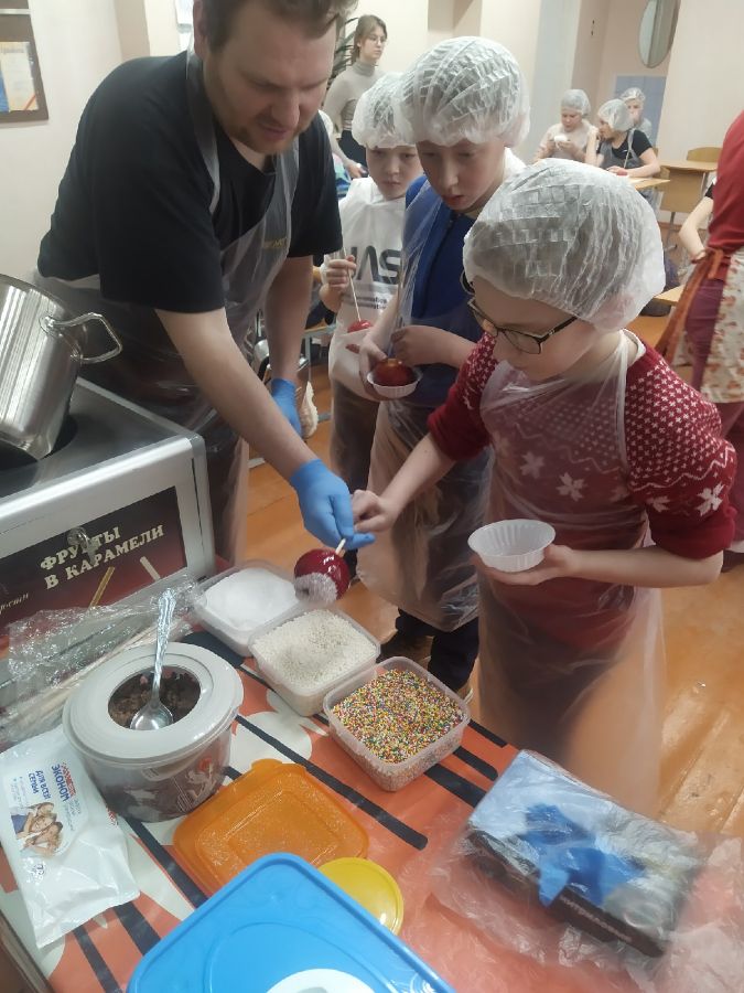 Поздравление придумали необычное – провели мастер-класс. Дети сами делали яблоки в карамели.