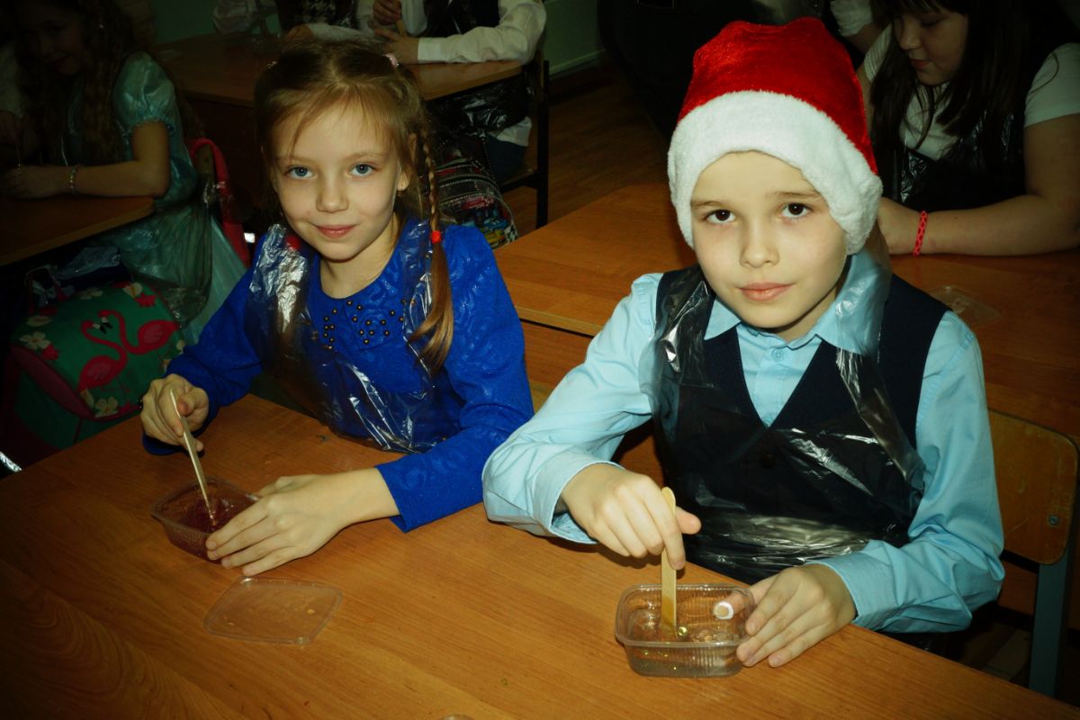 Ребята работали с большим увлечением. Потом ученики поздравляли друг друга с окончанием полугодия, дарили подарки, сделанные своими руками, читали стихи, желали всем веселых интересных каникул и незабываемого Нового года.