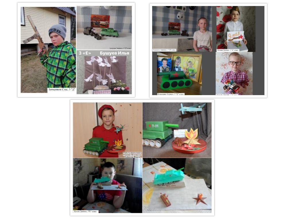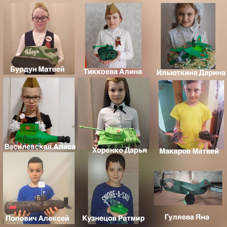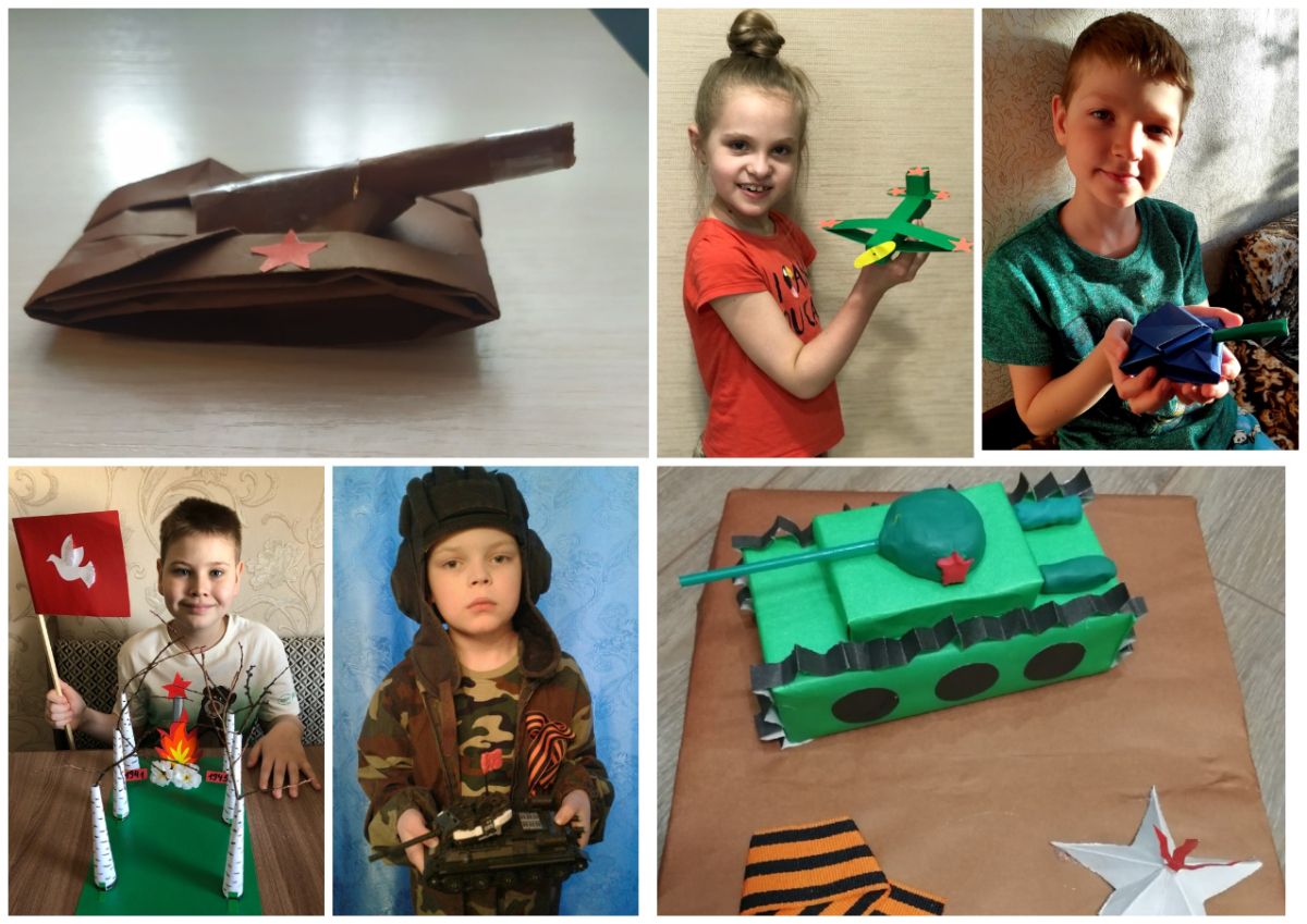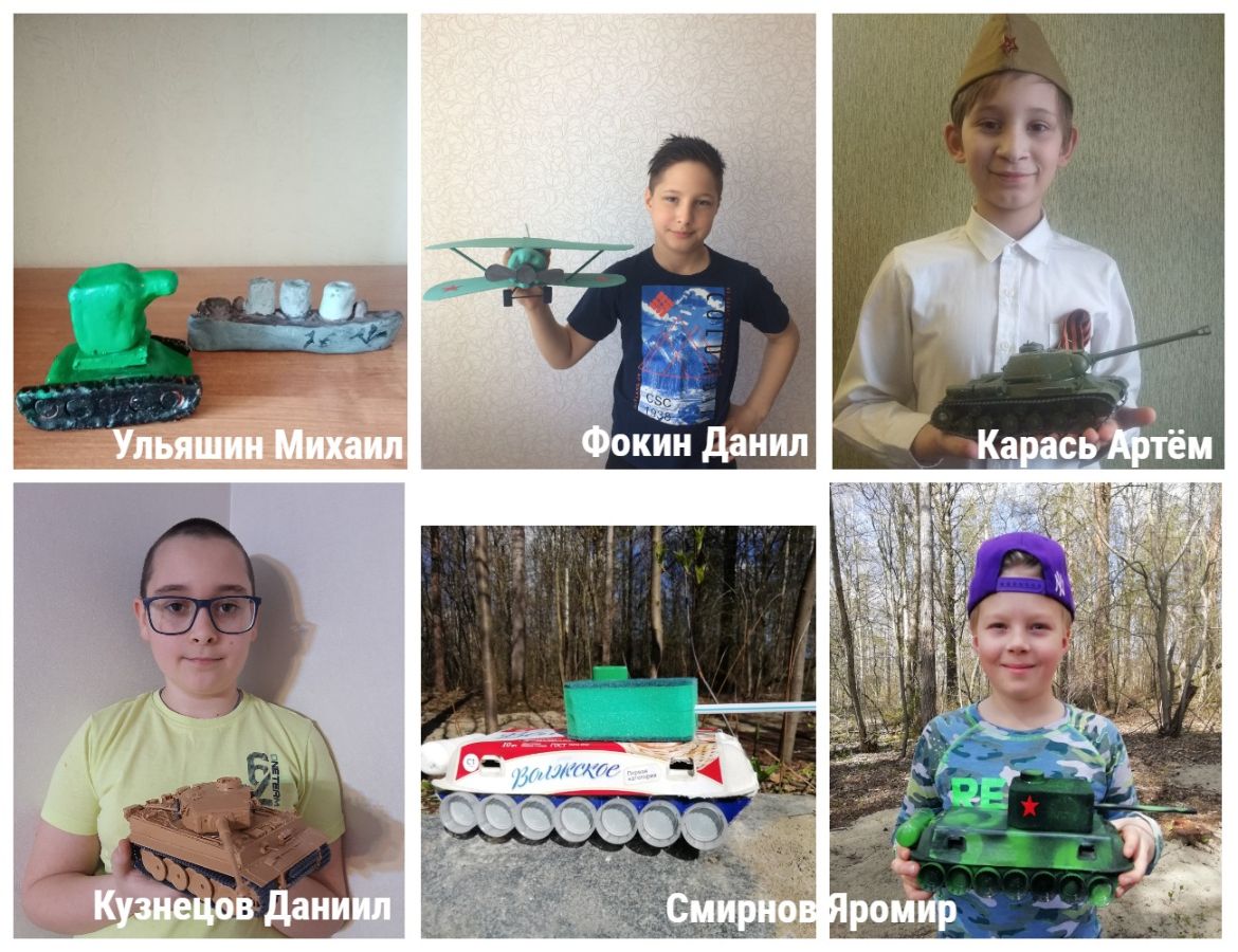 В ход пошли разные материалы. Миша Ульяшин выполнил макет советского тяжелого штурмового танка КВ-2 и линкора класса «Севастополь» из глины. Даня Фокин мастерил свой вертолет По-2 из пластиковых бутылок, картона, крышек от пластиковых бутылок, палочек для суши.