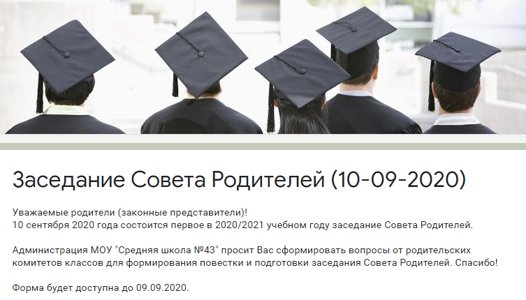 На заседание приглашаются председатели родительским комитетов классов. Для формирования повестки и подготовки ответов на вопросы убедительно просим Вас заполнить в срок до 09.09.2020 предлагаемую форму.