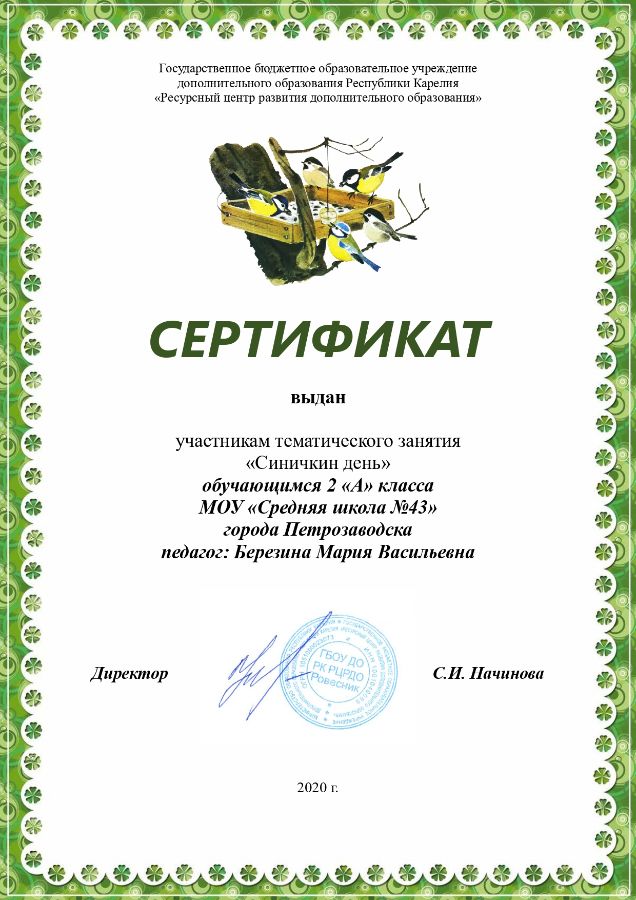Дети познакомились с семейством синицевых и многообразием их видов, распространенных на территории Республики Карелия. А на память останется сертификат об участии.