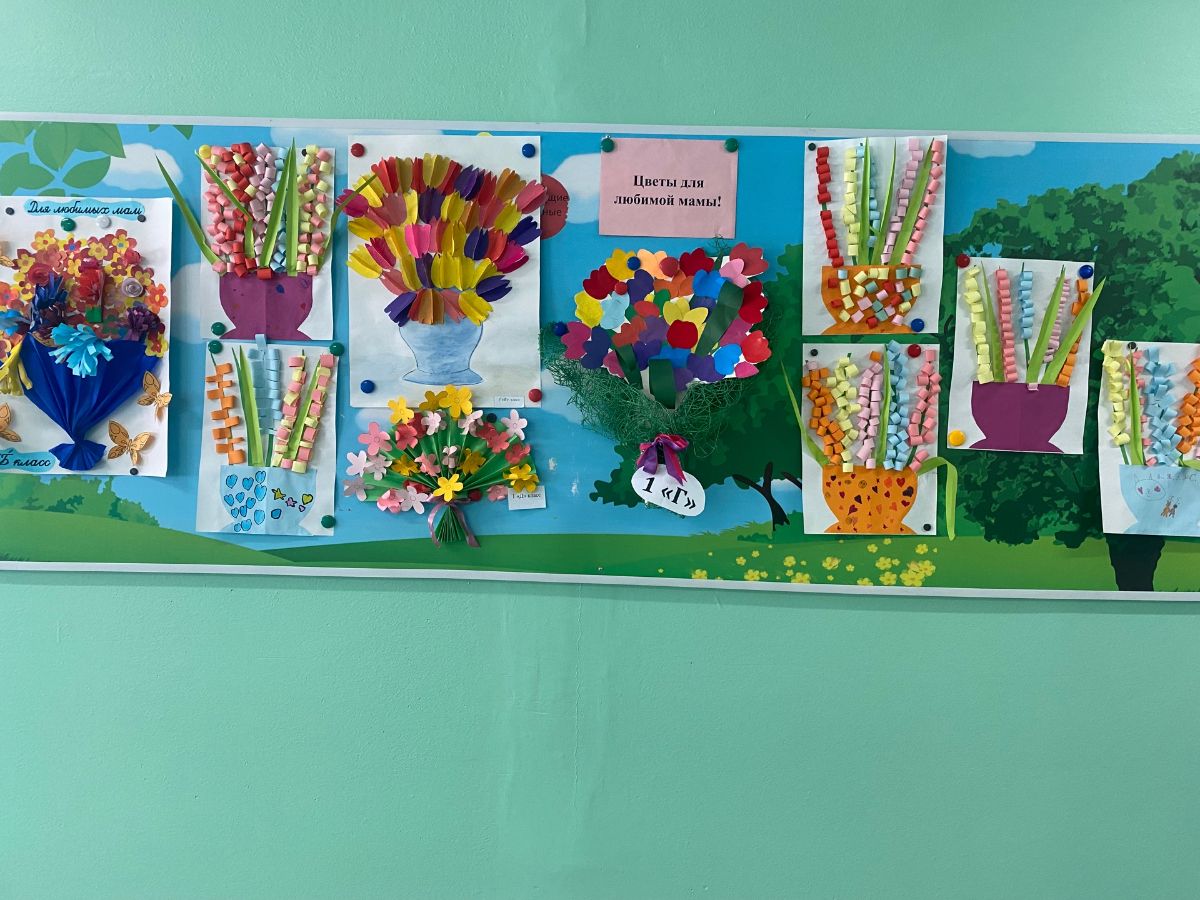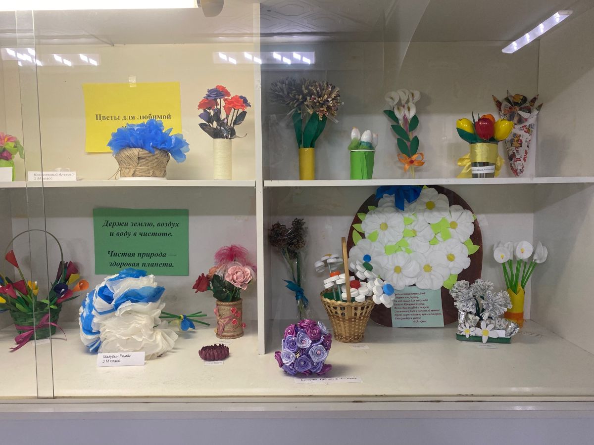 Детская организация «Радуга» провела выставку «Цветы для любимой мамы».В данной выставке приняли участие ученики начальной школы. Первоклассники выполнили коллективные работы, а ученики 2-4 классов предоставили на выставку поделки из бросового материала (с целью продемонстрировать новые возможности уже использованных бытовых материалов).